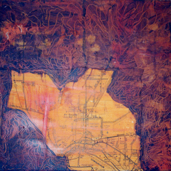 (Untitled) Magnolia Hotel painting 2002 - 2003 collaged map with acrylic on MDF & masonite 15 x 15 inches